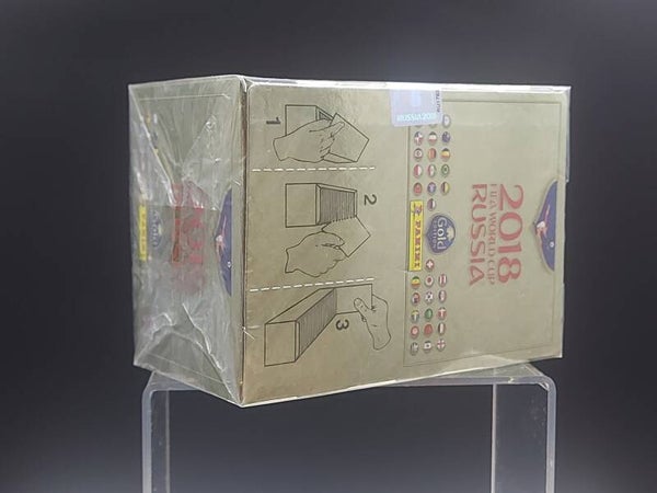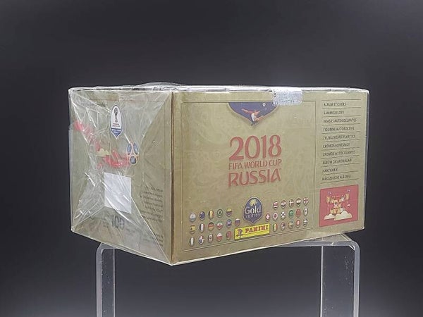 Box sigillato Panini Russia 2018 Gold edition distribuito in Svizzera. Il box contiene 100 bustine. Condizioni come da foto.